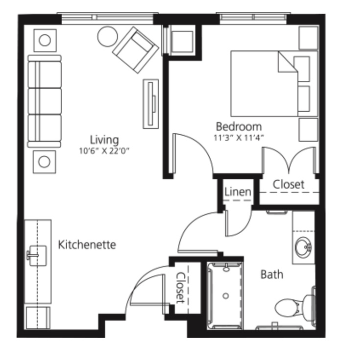 Choose a studio, one-bedroom, or two-bedroom floor plan to fit your needs.